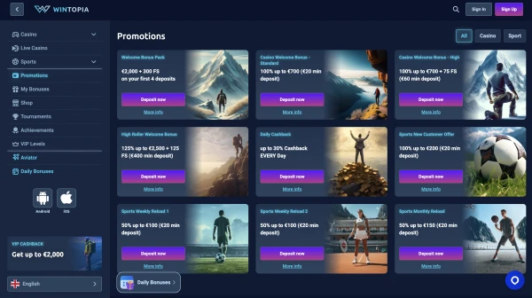 Offriamo ricompense basate sul deposito per il casinò e lo sport, oltre a promozioni settimanali e mensili. Troverai sempre i termini chiave nella scheda promozione, inclusi requisiti di puntata e giochi idonei. Al momento non indichiamo un bonus senza deposito del casinò Wintopia per l’Italia, quindi la maggior parte delle ricompense richiede un deposito qualificante.